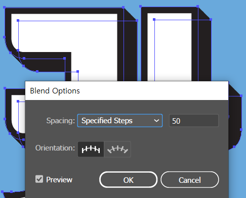 블렌드 툴을 더블클릭해서 아래와 같이 값을 넣으면 smooth 하게 처리된다.