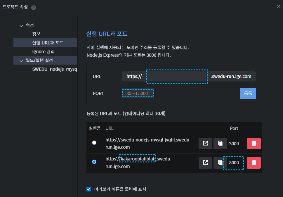서버 실행 URL과 포트 지정