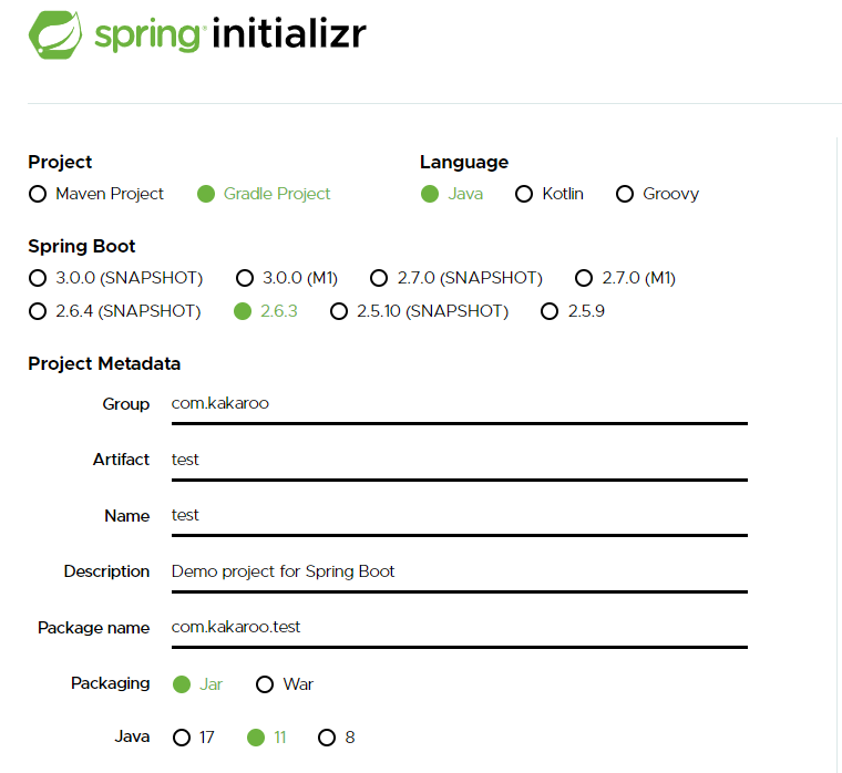 또는 https://start.spring.io/ 에서 생성할 project 파일들을 generation 합니다.