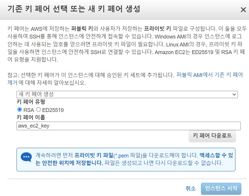 > 새 키 페어 생성, 키 페어 다운로드(pem key) -> 로컬디렉토리에 저장