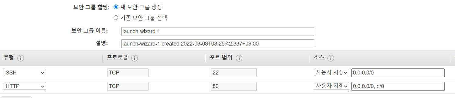 > 보안 그룹 이름 등록 > SSH : 22 : 내 IP 선택 (pem 키와 지정된 IP에서만 ssh접속 가능하도록)