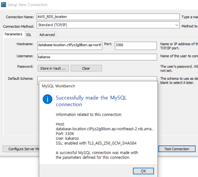 HostName은 역시 RDS 보안그룹의 엔드포인트를 복사하고 username/password 를 넣어주면 아래와 같이 성공적으로 연결이 됩니다.