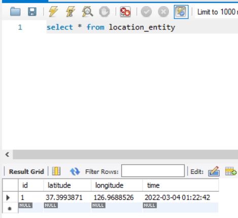 select * from location_entity (사전에 value 값을 test 용으로 넣어서 하나의 entity가 보이는 것입니다.)
