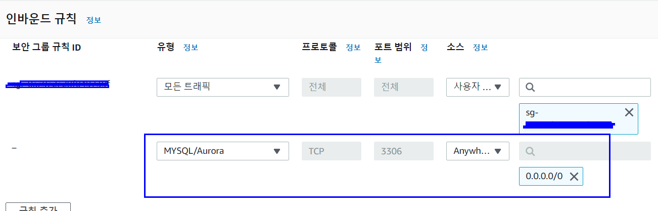 >> MySQL/Aurora , TCP , 3306 , 사용자 지정 , 보안그룹 ID