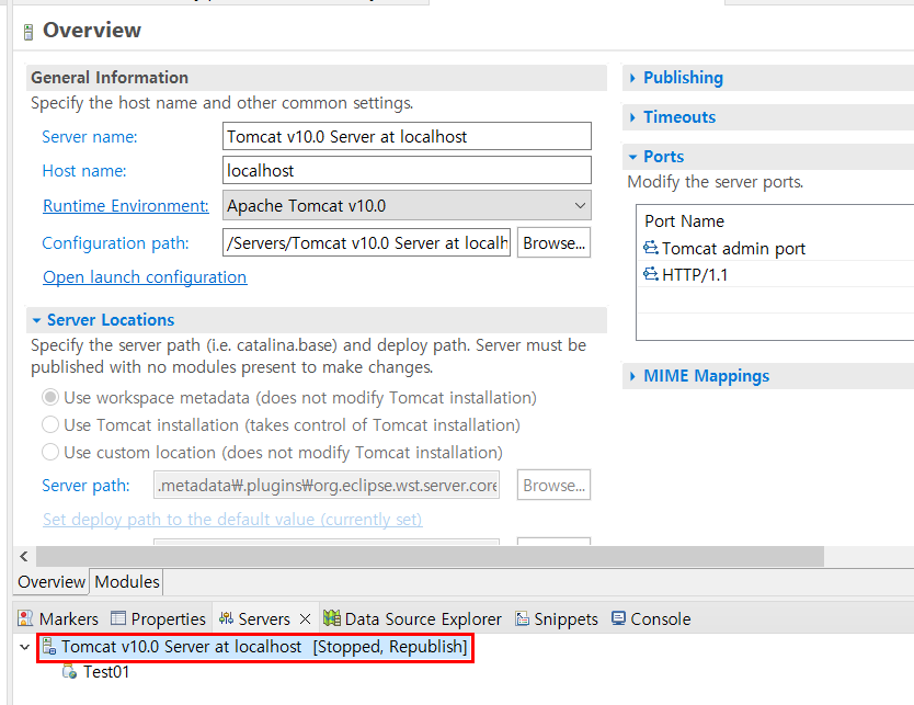 웹 프로젝트만의 서버 환경정보를 구성하고 싶다면, "Project Explorer"의 "Test01"에서 오른쪽 버튼을 클릭하여 메뉴 [Java EE Tools > Generate Deployment Descriptor Sub]를 클릭합니다.