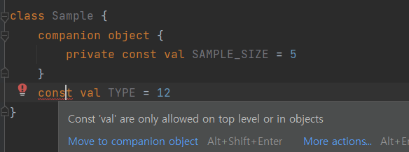 때문에 일반적으로 companion object 안에 상수로 선언하게 된다.
