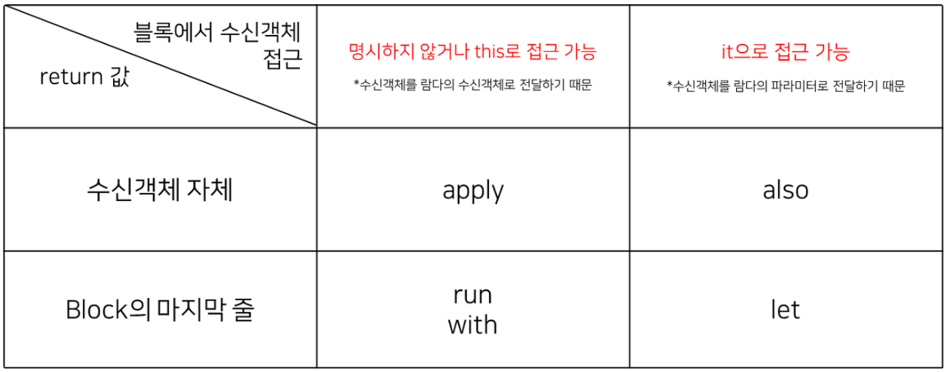 그중에서도 apply, with, let, also, run 과 같은 범위 지정함수에 대해 알아보겠습니다.