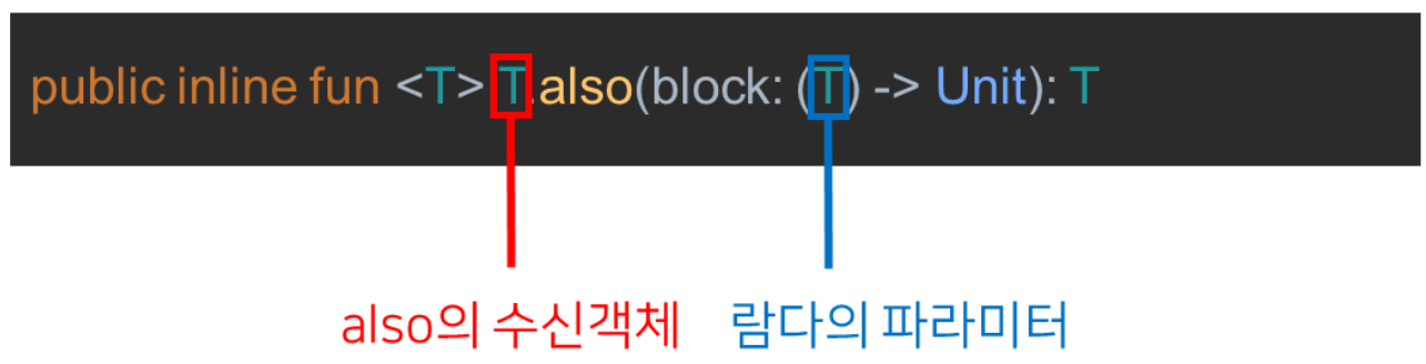 수신 객체 람다가 전달된 수신 객체를 전혀 사용 하지 않거나 수신 객체의 속성을 변경하지 않고 사용하는 경우 also 를 사용합니다.