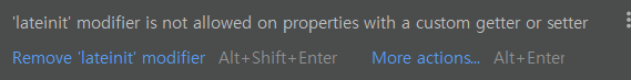 - lateinit 사용한 변수는 setter()/getter()를 사용할 수 없습니다.