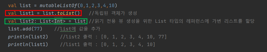 초록색 박스는 읽기전용 타입인 List 타입의 레퍼런스에 원본 가변리스트를 할당하였다.