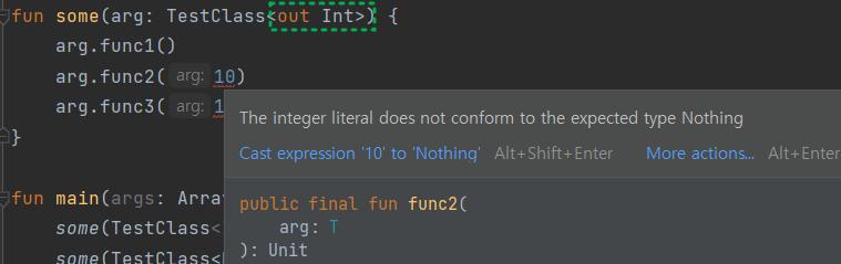 아래 TestClass에는 annotation 이 없는 상태로 invariance 상태입니다. invariance는 제네릭 타입의 형 변환을 허용하지 않습니다. 아래처럼 some() 함수의 파라미터로 TestClass<Int> 으로 지정했기 때문에 TestClass<Number> 타입의 파라미터는 허용되지 않습니다.