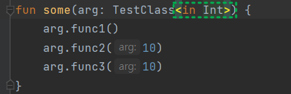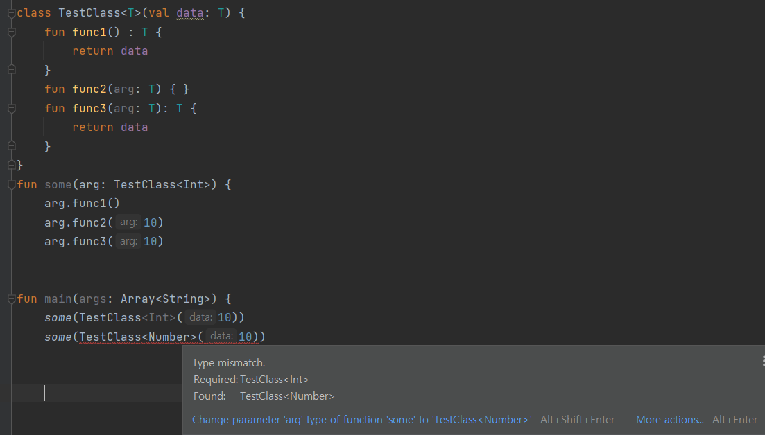 아래 TestClass에는 annotation 이 없는 상태로 invariance 상태입니다. invariance는 제네릭 타입의 형 변환을 허용하지 않습니다. 아래처럼 some() 함수의 파라미터로 TestClass<Int> 으로 지정했기 때문에 TestClass<Number> 타입의 파라미터는 허용되지 않습니다.